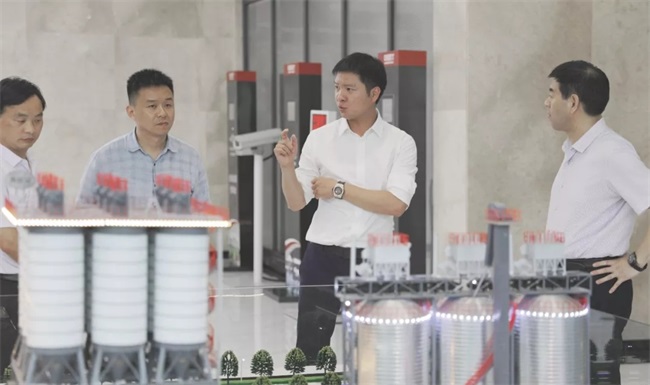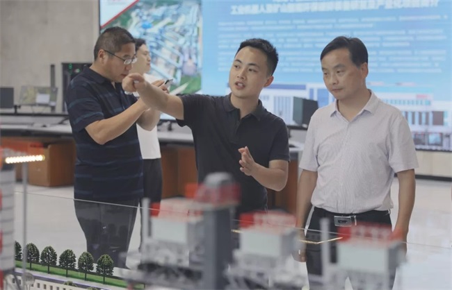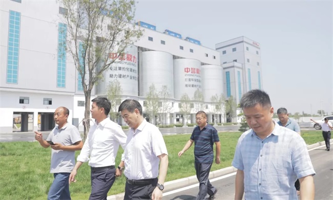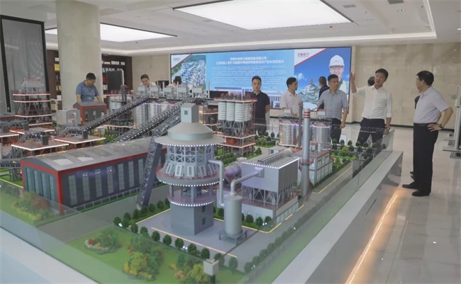 隨后,考察團來到中譽鼎力智能裝備新廠區,參觀了中譽鼎力五位一體循環建材產業園項目沙盤,并在接待室進行座談。