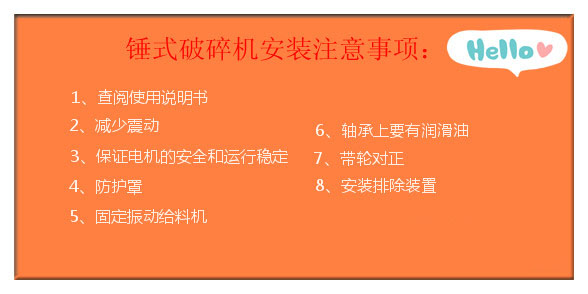 七、在安裝的時候要注意將電機的皮帶輪和錘式破碎機的帶輪對正,要時刻注意松緊性適中。用手轉(zhuǎn)動錘式破碎機的轉(zhuǎn)子,看看是否會正常運轉(zhuǎn),有沒有磨損的現(xiàn)象,可以試用半個小時,若無問題,方可進(jìn)行使用。